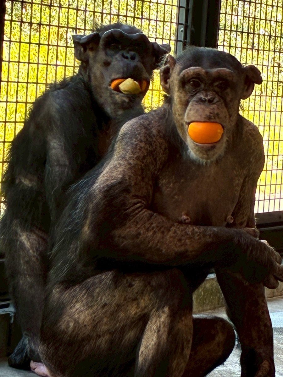 二人一緒に居させてもらえてるのね✨美味しそうな果物🍊、しっかり食べて新しい環境を楽しんでね!📣 #宮崎市フェニックス自然動物園 #チンパンジー #イブ #ニナ x.com/m_phoenixzoo/s…
