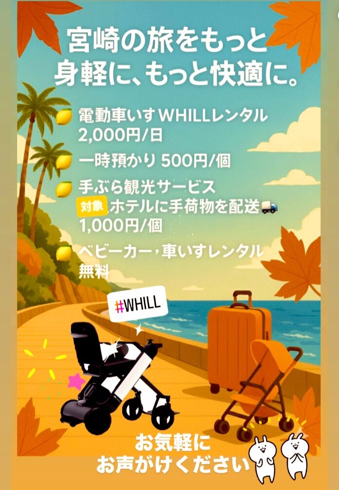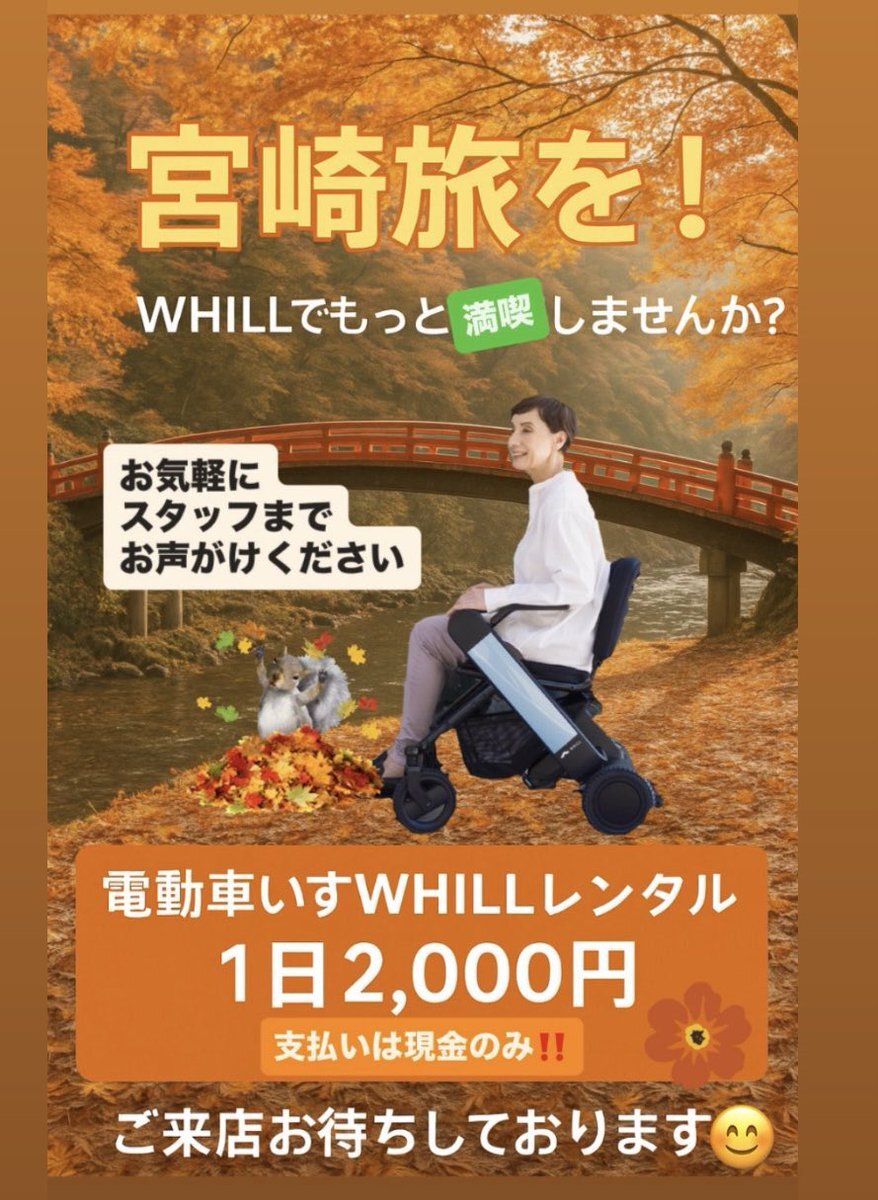 🍁秋の宮崎旅を、もっと快適に!🍁 観光地めぐりやおでかけの際におすすめ🚶‍♀️ 電動車いす WHILL(ウィル)レンタルで、坂道や長距離の移動も安心・快適です✨ 📍1日 2,000円(現金のみ) ご利用希望の方は、お気軽にスタッフまでお声かけください。 #宮崎観光 #宮崎旅行 #WHILL #電動車いすレンタル pic.x.com/bxq0NzeGIV