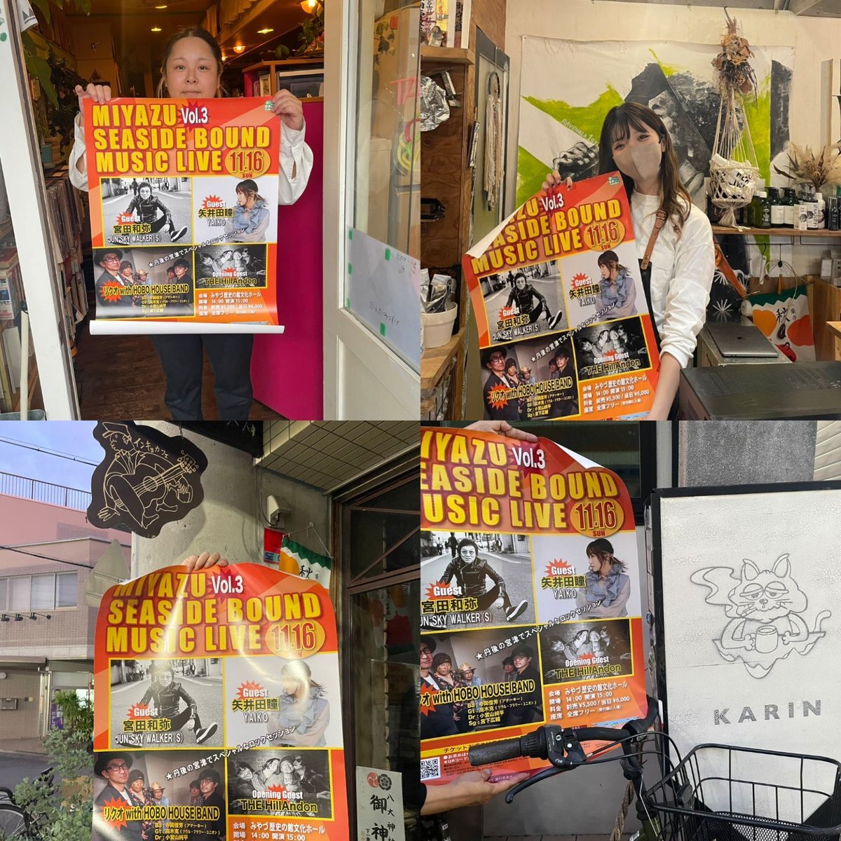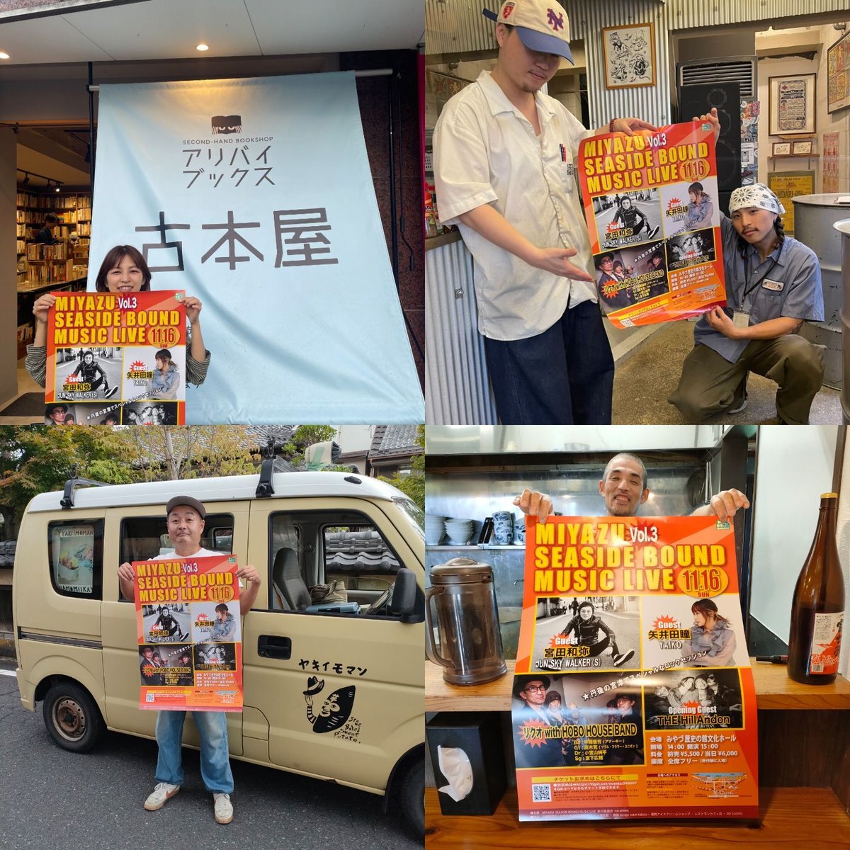 告知広報活動ありがとございます!京都一乗寺チームの皆様にも感謝! ①アリバイブックス 様 ②PIZZA MONSTAR HIDARI様 ③ヤキイモマン 様 ④チャクリキ 様 予約はこちら!メッセでも!お早めに!tiget.net/events/420238 #リクオwithHOBOHOUSEBAND #宮田和弥 #矢井田瞳 #TheHillandon #MSBML2025 pic.x.com/VkLJyBvrog