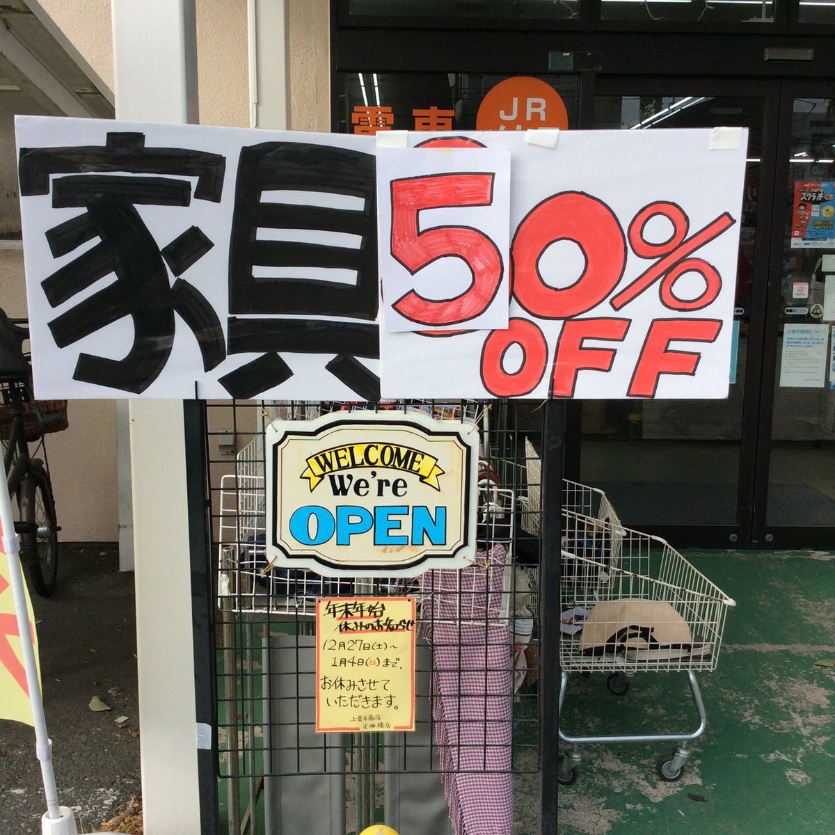 家具の入れ替え半額セール開催‼️ 表示価格から50%offの半額でお買い求めいただきます 開催期間は12月19日(金)・20日(土)・21日(日)の、本日から3日間です。 ※未精算でのお取り置きは致しかねます。 #家具 #半額セール #リサイクルショップ #上青木商店 #上青木商店天神橋店 #川口市 #JR忘れ物 pic.x.com/5gMiz58Y9T