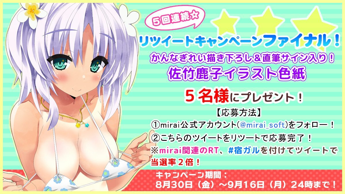 【いよいよファイナル🌟RTキャンペーン】 かんなぎれい描きおろし&直筆サイン入り イラスト色紙プレゼントキャンペーンファイナル‼️ 抽選で5名様に #宿ガル 鹿子の色紙をプレゼント👙✨ ①@mirai_soft をフォロー ②このツイートをRT 応募期間:9/16 24:00まで! 詳細⇒mirai-soft.net/campaign/ pic.x.com/2MEk0eHnPS