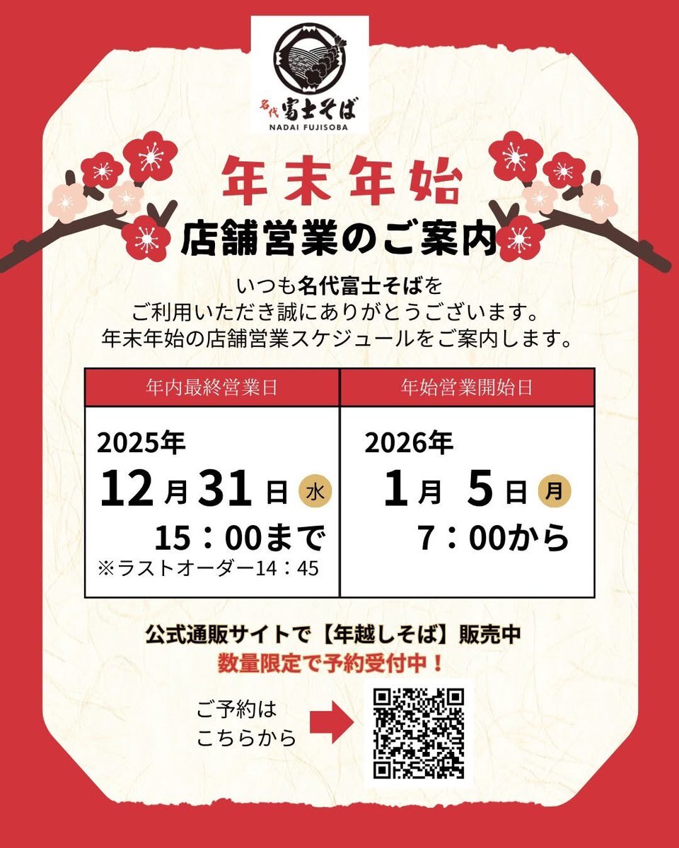 ✨名代富士そば店舗 年末年始営業のご案内✨ 年内は12月31日(水)15時で営業を終了する予定です⏰(ラストオーダー:14時45分) 新年は1月5日(月)朝7時より、営業を始めます!🌅 なお、誠に勝手ながら2026年1月1日(木)~1月4日(日)は休業とさせて頂きます。