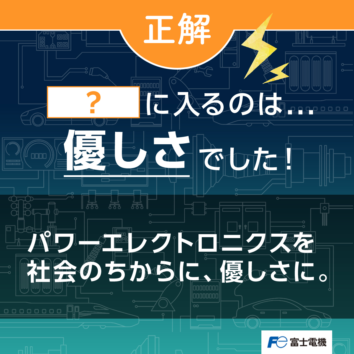 / #富士電機 のPRコピークイズ 正解発表🎉 \ ⬜︎に入る言葉は【優しさ】でした🙌 PRコピーは、富士電機のコア技術であるパワーエレクトロニクスで、地球環境と人に優しい、豊かな社会づくりに貢献する決意を表現しています。 当社のことをもっと知るには、ツリー投稿をチェック✅ pic.x.com/7gUsdenMYm x.com/fujielectric_j…