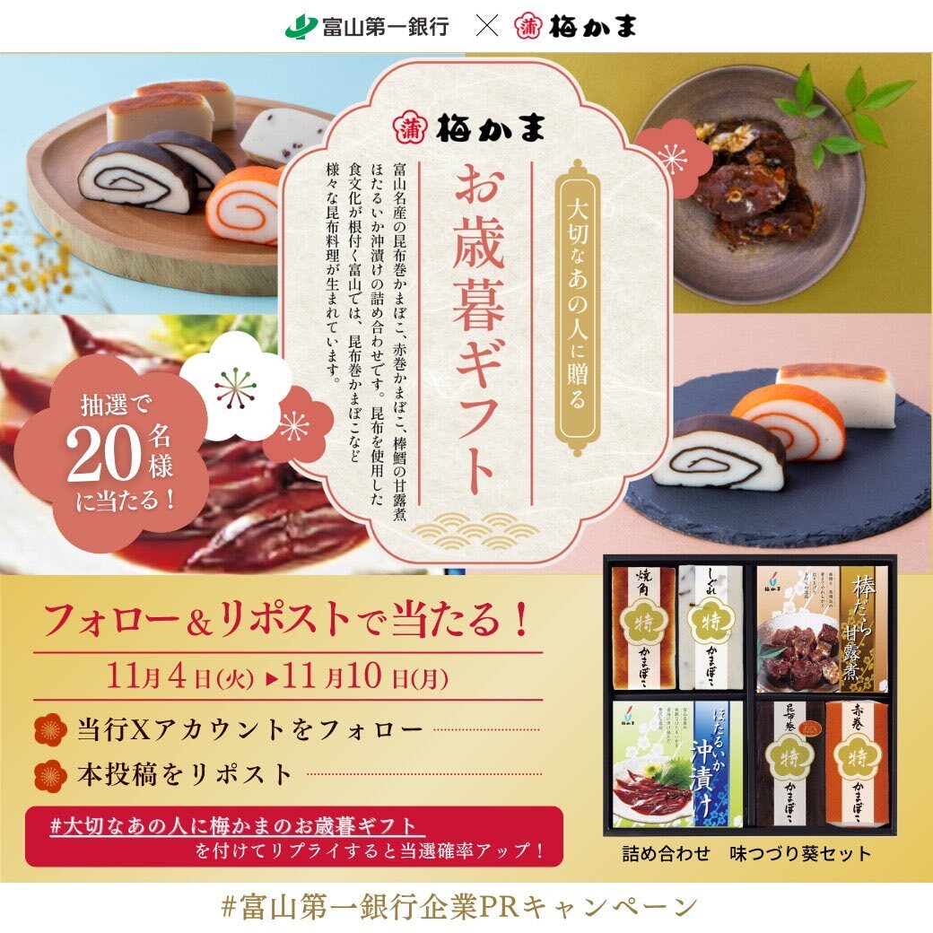 冬の贈り物にぴったりな富山の味覚🎁✨ 上品な昆布巻かまぼこやほたるいかの沖漬けなど、ひとつひとつに職人の心が込められた「梅かま」。 大切なあの人へ、“ありがとう”の気持ちとともに贈りたい逸品です💐 #大切なあの人に梅かまのお歳暮ギフト #富山第一銀行 #梅かま x.com/firstbank_t/st…