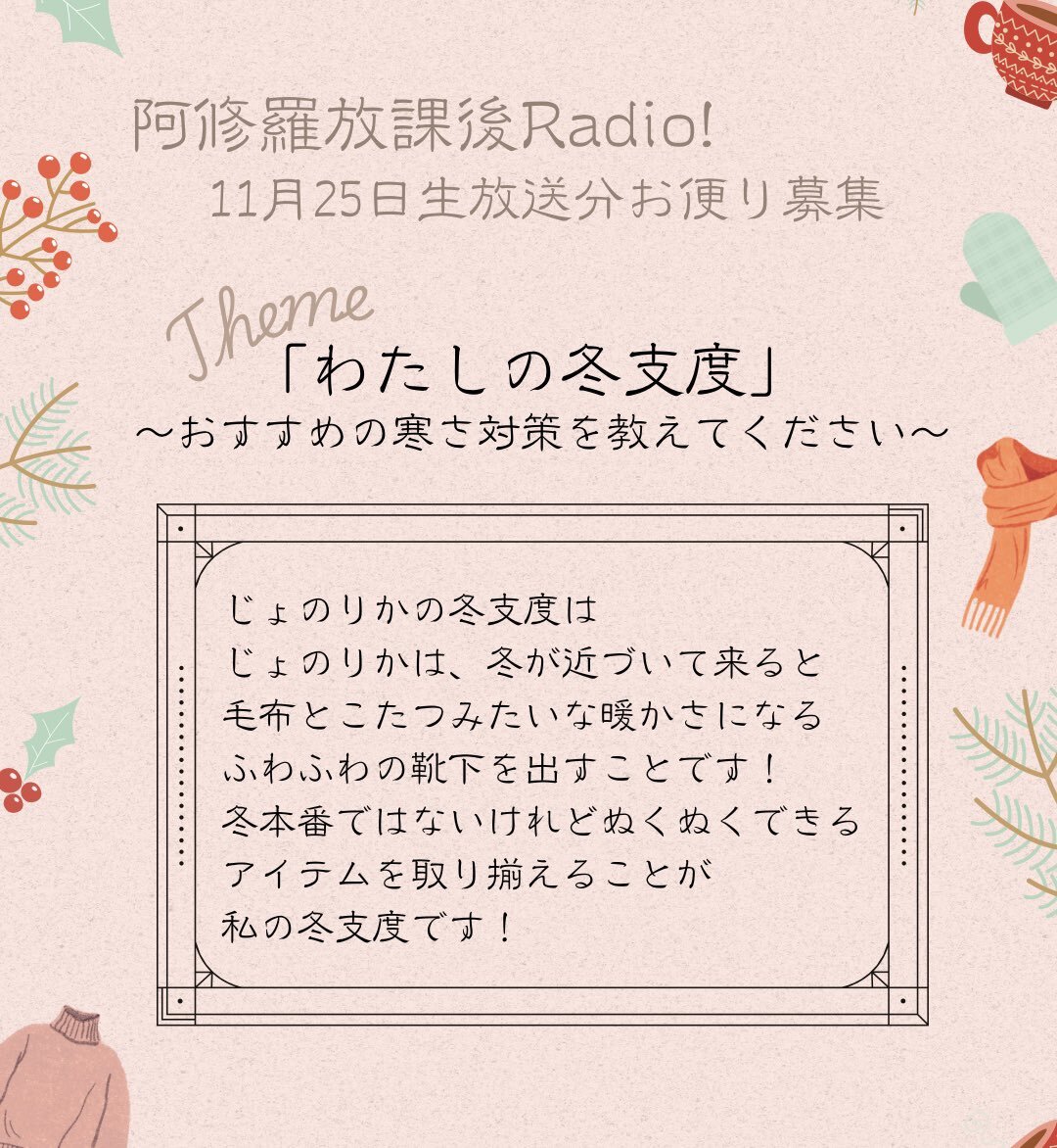 【お便り募集】 〜11月25日(火)生放送分〜 お便りのテーマは、「冬支度」🧣 おすすめの寒さ対策を教えてください! じょのりかの冬支度は、 ふわふわの靴下です。冬本番ではないけれどぬくぬくできるアイテムを取り揃えることが私の冬支度です! #ラジオ #大学生 #寒さ対策 #あしゅかご pic.x.com/GY4W0xDjKQ