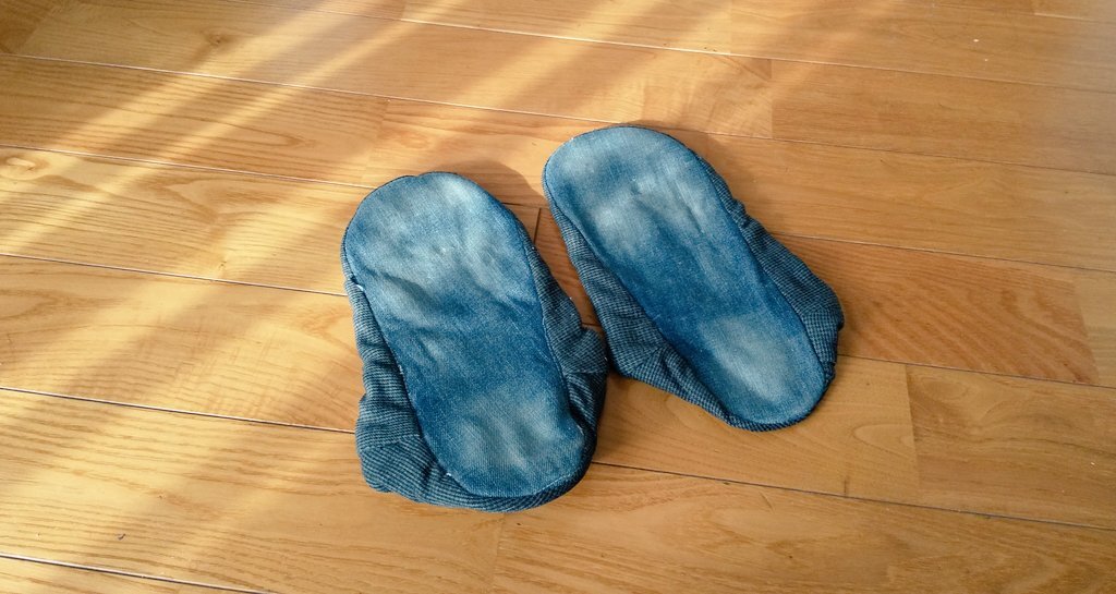 ルームシューズの裏側失礼します。 さすが、男性用デニム✨。補修が要るかと思ったけど全然破れてない。今年もいける😺 #リメイク #寒さ対策 pic.x.com/9cDDmz1J9R
