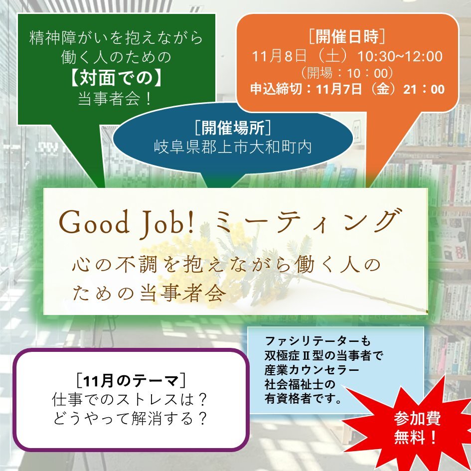 #精神障がい #精神疾患 を抱えながら働く人の #当事者会 を #岐阜県 #郡上市 大和町で #対面 で開催🫡居住地・勤務地・雇用形態に制限はなく現地に来られる人であれば誰でも🆗 #参加費無料 ❗️次回は11月8日(土)🙋🏻 11月のテーマ:仕事でのストレスは?どうやって解消する? forms.gle/MMp6nfdt5WJvhx… pic.x.com/cHNMvj7jL4