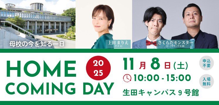 #上田まりえ 出演情報〗 ⠀ 母校 #専修大学 のホームカミングデー🏫 2つのトークショーに出演します! 専大の卒業生や在校生はもちろん、どなたでも参加可能✨ 終演後は物販も行う予定なので、サインなどもできる限り対応いたします🙏 pic.x.com/S8rRuzN6fw