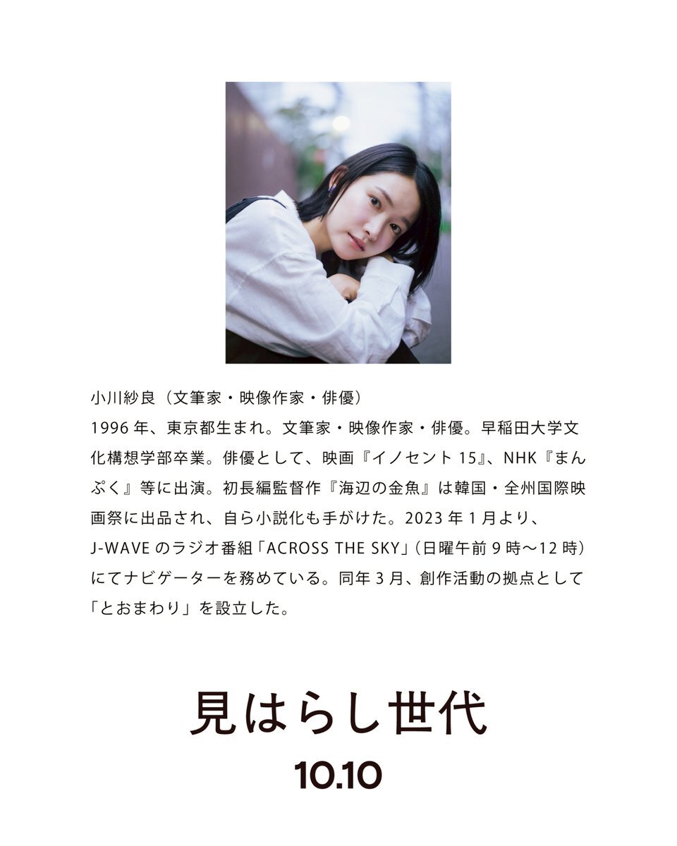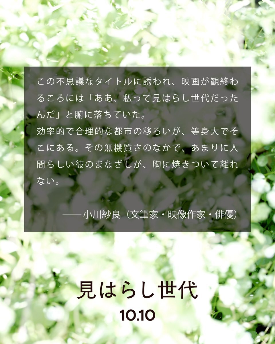 ⋮⋮⋮ 𝙍𝙀𝙑𝙄𝙀𝙒 ⋮⋮⋮ 文筆家・映像作家・俳優の小川紗良さんからコメントをいただきました。 この不思議なタイトルに誘われ、映画が観終わるころには「ああ、私って見はらし世代だったんだ」と腑に落ちていた。 #小川紗良 @iam_ogawasara #見はらし世代 ⌇ miharashisedai.com pic.x.com/kA8BTv5hN4