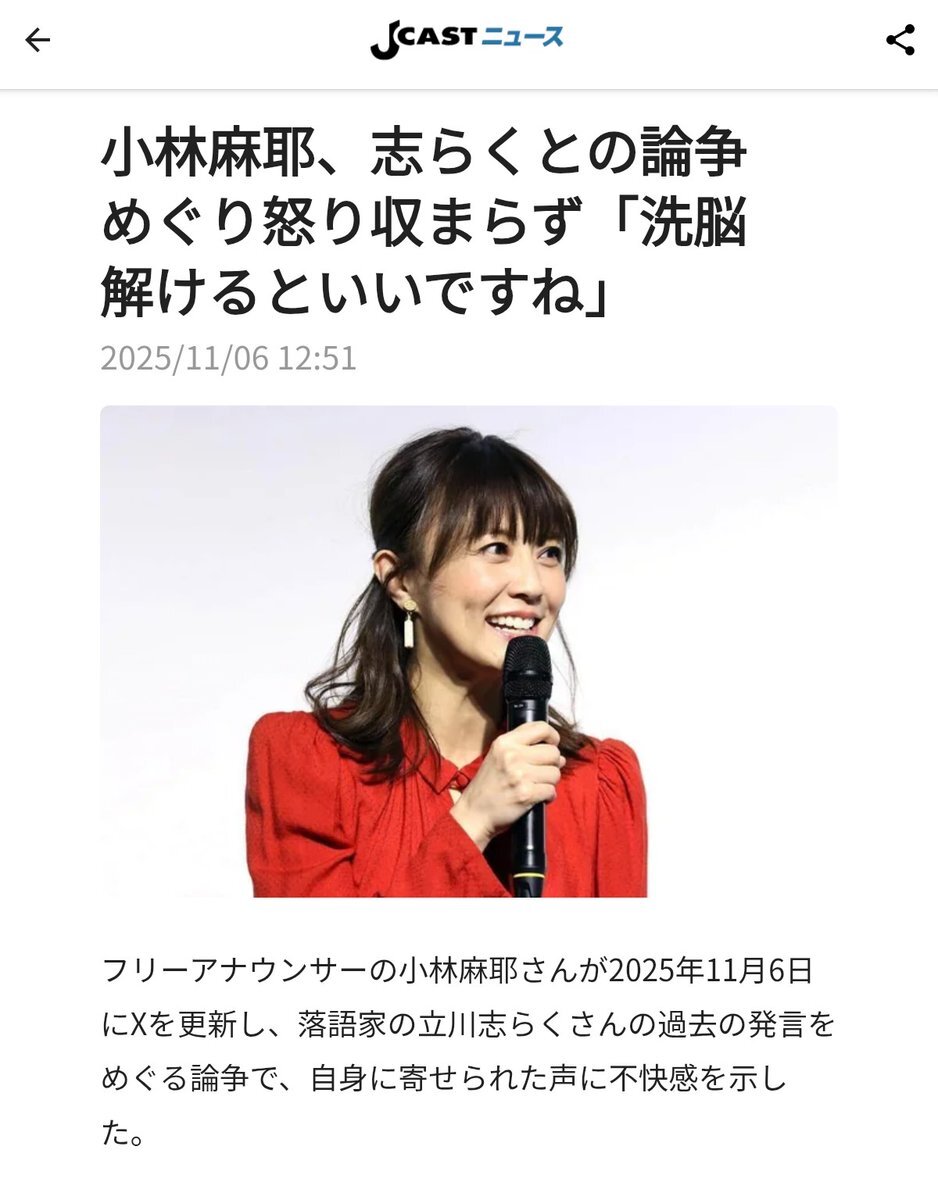 小林麻耶、志らくとの論争めぐり怒り収まらず「洗脳解けるといいですね」 #小林麻耶 j-cast.com/2025/11/065090…