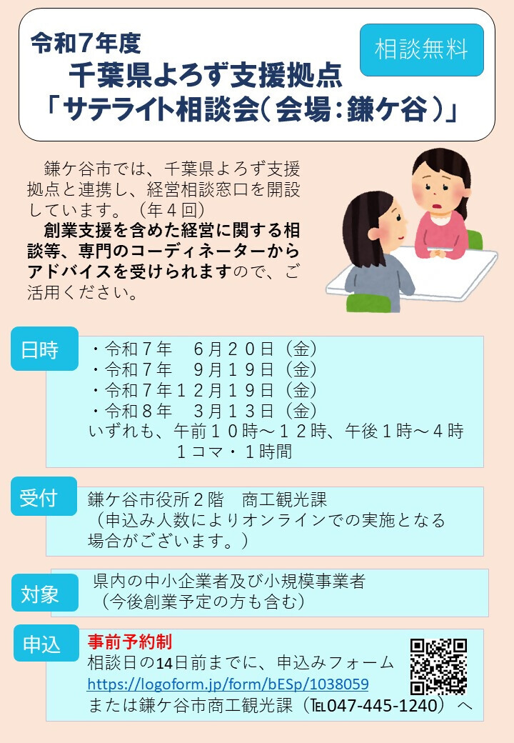千葉県よろず支援拠点「サテライト相談会」のお知らせ。#鎌ケ谷市 では、千葉県よろず支援拠点と連携し、経営相談窓口を年4回開設しています。令和7年度第3回目は、12月19日(金)に開催。詳細は、市HP city.kamagaya.chiba.jp/jigyosha/syouk… #経営相談 #創業支援 #中小企業者 #小規模事業者 【商工観光課】 pic.x.com/GMtBoLJLm8