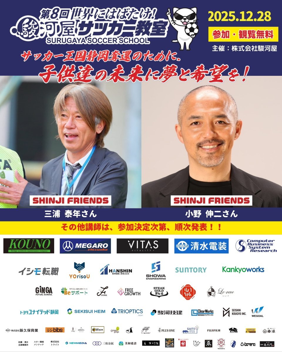 12/28(日)開催 第8回世界にはばたけ❗️ #駿河屋サッカー教室⚽️ #三浦泰年 さん #小野伸二 さんが参加決定✨ 静岡市草薙総合運動場 陸上競技場に豪華講師陣たちが大集合💥 なんと参加・観覧は無料😆✨ 駿河屋は未来を担う子どもたちを応援します❣ 👇詳細は返信欄をチェック pic.x.com/1GXu8IfAtb