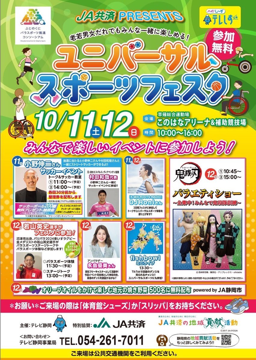 今週末の10/11,12の2日間、草薙総合運動場このはなアリーナ等でユニバーサルスポーツフェスタが行われます! 11日は #小野伸二 さんのサッカーイベント、12日はパリパラ2024車いすラグビー金メダリストの若山選手も参加、他にも鬼滅の刃のショーや、#fishbowl のミニライブなど盛りだくさんの内容です pic.x.com/5WMyEJxWcx