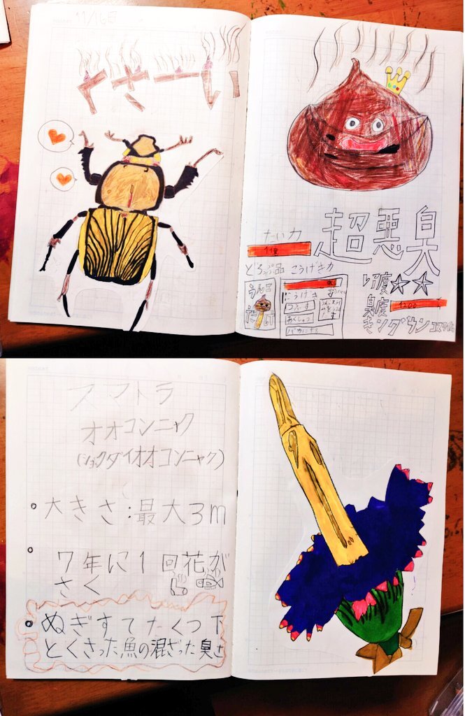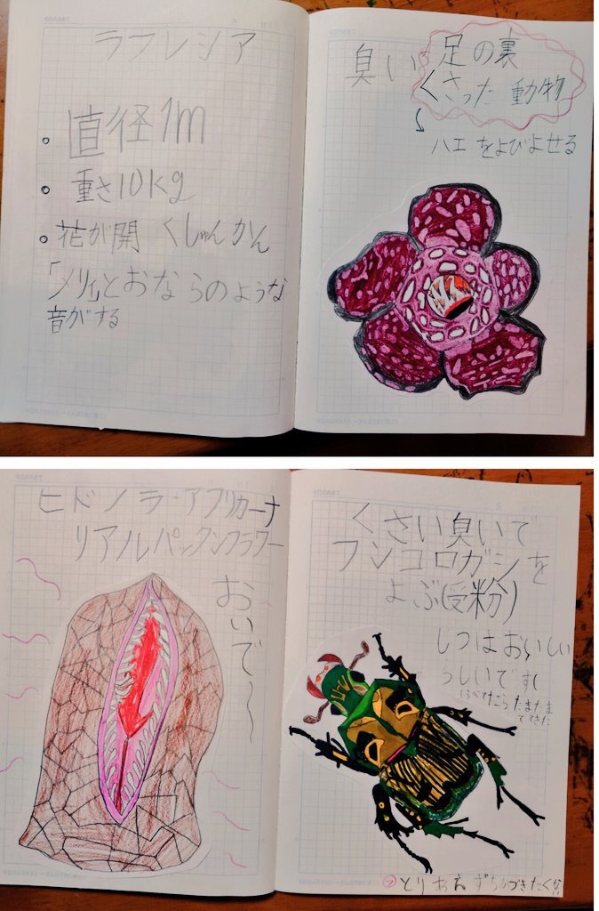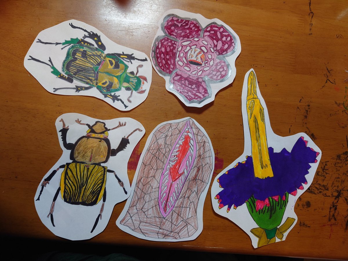 #小5 #家庭学習 #ラフレシア #スマトラオオコンニャク #ヒノドラ #フンコロガシ 👦🏻🧡今回のテーマは『くさーーーい』 👩ゲッ🤣 臭い植物と、臭いの大好き昆虫勢揃い♥️。男のこって💩ネタ好きよなあ笑 ラフレシアはいったんベタ塗りしたものを電動消しゴムで消して模様出したよ pic.x.com/28Kr014AsX x.com/kZu49A5CBmnkWe…