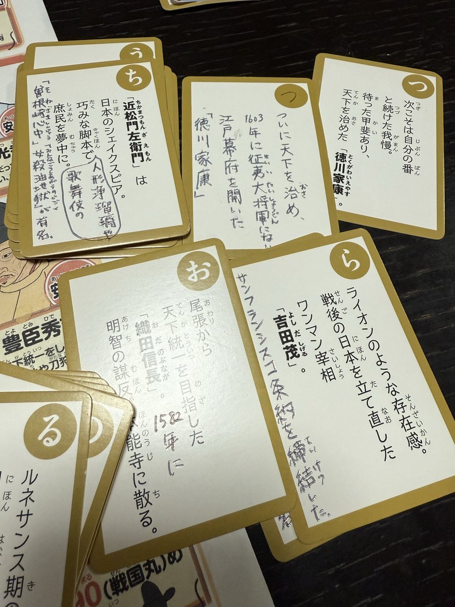 だいぶ前に百均で買った歴史人物トランプになぜかいきなり兄弟がどハマり。 でもやってみたら全然知識にならない読み札が多かったので修正してる😅 宮本武蔵もたぶんテストに出ないよね? ほかの人物に変えたいけどどうしようかな〜 卑弥呼も簡単すぎるから別のに変えようかな🤔 #5歳 #小5 #知育 pic.x.com/C9jnioyiQw