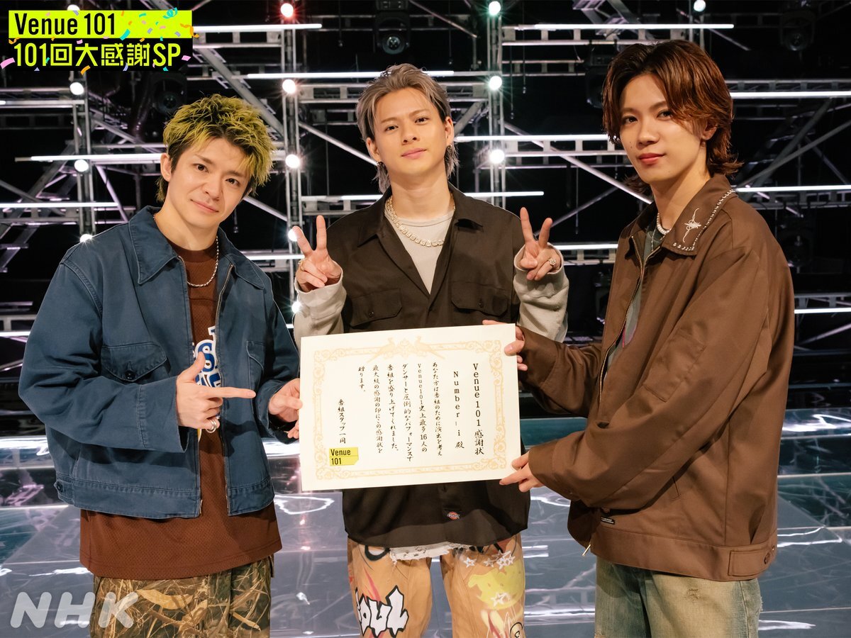 🎉NOW ON AIR #Venue101_101回SP🎉 ✨#Number_i へ感謝状✨️ 放送はNHK ONEで配信中📺 ここから見られます👇️️ web.nhk/tv/an/venue101… 番組史上最多の 16人のダンサーとパフォーマンス🕺 圧巻のパフォーマンスを ありがとうございました💫