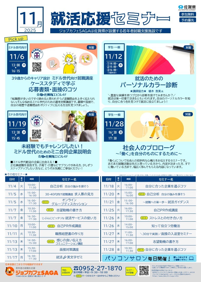 / 11月セミナー 申込受付中☺ \ 11月は「#パーソナルカラー診断」「#ミドル世代 向け就職講座」「ミドル世代のための合同企業説明会」などを開催❣ ▼詳しくはこちら jobcafe-saga.info/seminarevent?d… #26卒 #27卒 #新卒 #転職 #就職支援 #セミナー #就職活動 #就活 #就職氷河期世代 #佐賀 pic.x.com/tAgZErIYb8