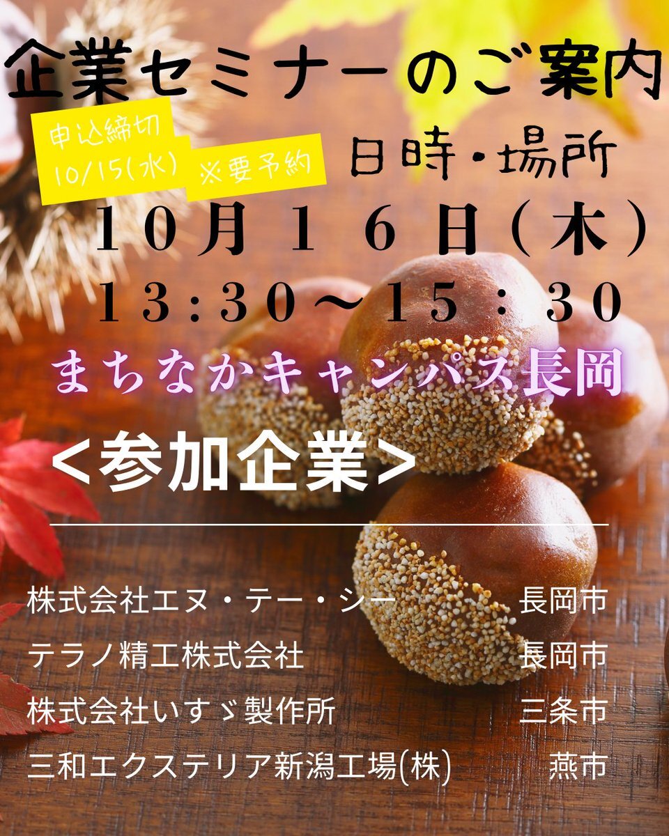 【企業セミナー開催しま~す📢】 10月16日(木)13:30~ セミナー参加は予約が必要です。 予約の締切は ~10月15日(水)15時 詳しくは三条テクノスクールHPまで↓↓↓ techno.ac.jp/topics/detail/… #職業訓練 #雇用型訓練 #正社員 #就職活動 #履歴書不要 #服装自由 #参加費無料 #三条テクノスクール主催 pic.x.com/4BPDOVGEAh