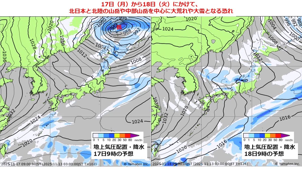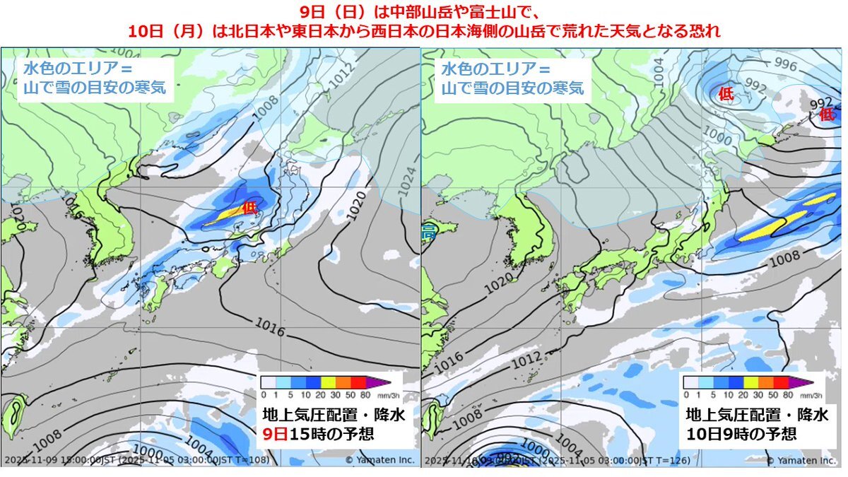 9日(日)は中部山岳や富士山で、10日(月)は北日本や東日本から西日本の日本海側の山岳で荒れた天気となる恐れがあります。今後、大荒れ情報が発表される可能性があるので、最新情報にご注意ください。詳しくは「山の天気予報」へ! i.yamatenki.co.jp #ヤマテン #山の天気予報 #大荒れ情報 pic.x.com/trqfgu6UyM