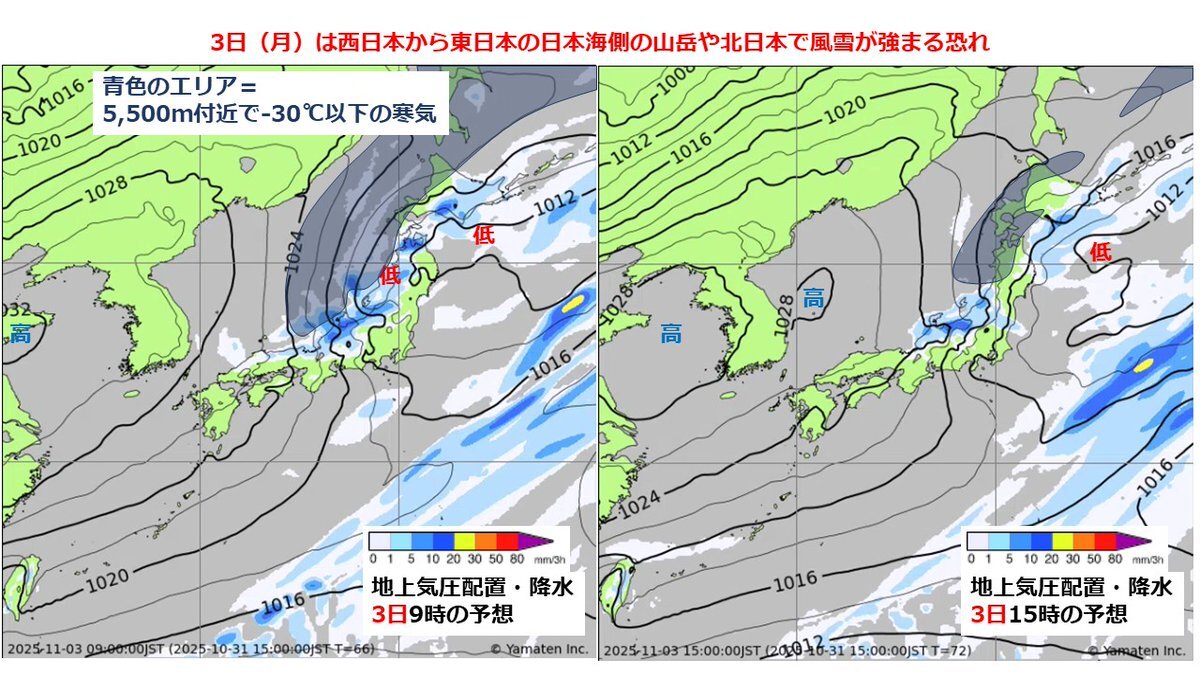 3日(月)は西日本から東日本の日本海側の山岳や北日本で風雪が強まる恐れがあります。今後、大荒れ情報などが発表される可能性があるので、最新情報にご注意ください。詳しくは「山の天気予報」へ! i.yamatenki.co.jp #ヤマテン #山の天気予報 #大荒れ情報 #風雪 pic.x.com/Uam0bWO28i