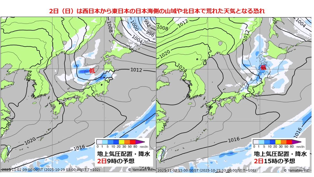2日(日)は西日本から東日本の日本海側の山域や北日本で荒れた天気となる恐れがあります。今後、大荒れ情報が発表される可能性があるので、最新情報にご注意ください。詳しくは「山の天気予報」へ! i.yamatenki.co.jp #ヤマテン #山の天気予報 #大荒れ情報 pic.x.com/LnI8OKMJS4