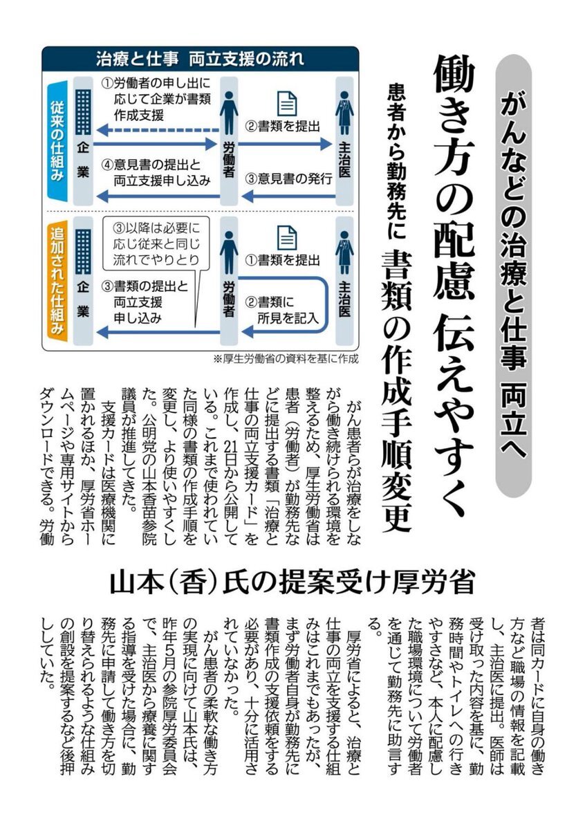 「使いにく」とのがん患者さんを聴き、#公明党 #山本香苗 参院議員が推進により、「#治療と仕事の両立支援カード」が使いやすく。 山本議員は、主治医から療養に関する指導を受けた場合に、勤務先に申請して働き方を切り替えられるような仕組みの創設を提案するなど後押ししていた。 #公明新聞電子版 pic.x.com/2IwAX8Q9NW