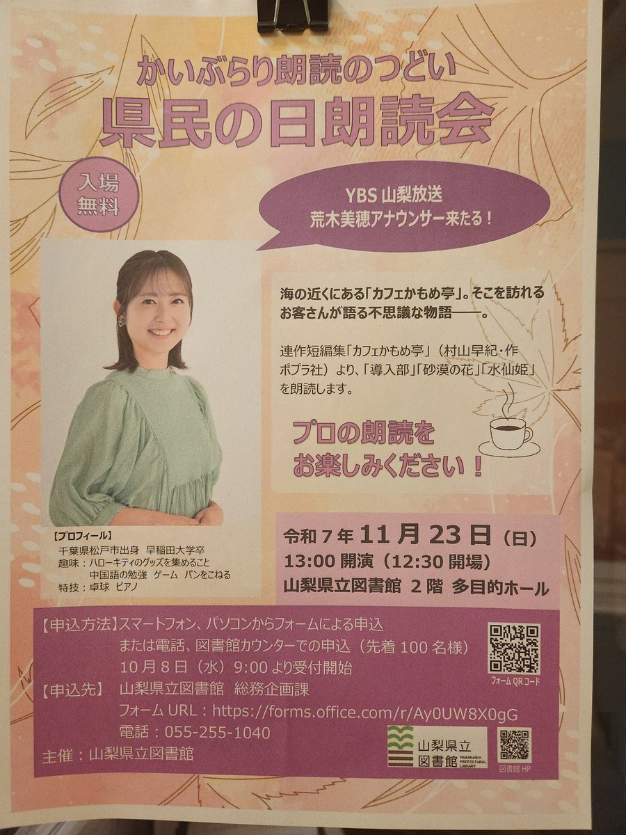 「かいぶらり朗読のつどい・県民の日朗読会」令和7年11月23日、山梨県立図書館にて開催。本日から受付開始📕。#YBS山梨放送 #荒木美穂アナウンサー #山梨県民の日 #山梨県立図書館 pic.x.com/NgpgpKyEeq