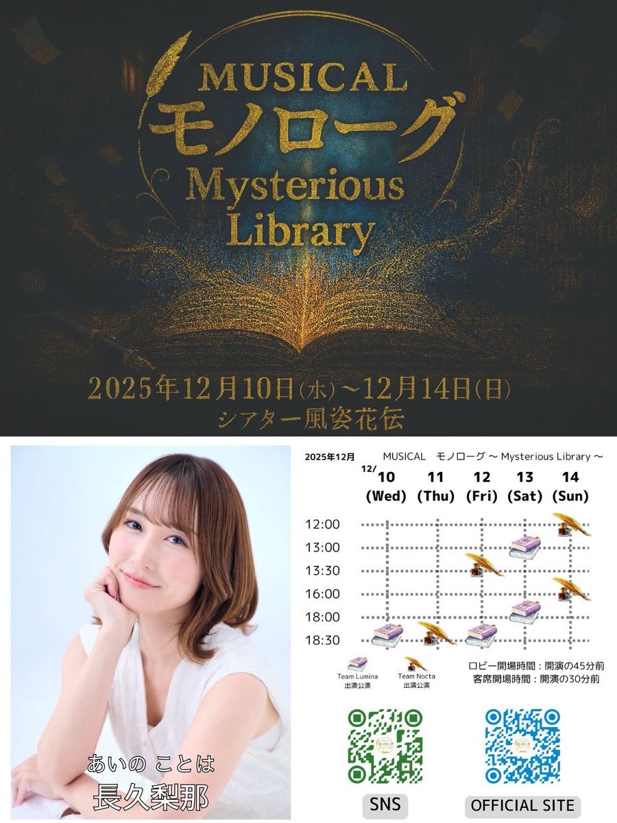 【情報解禁】 MUSICAL モノローグ 〜 Mysterious Library 〜 夜の図書館で見つかった“未完の物語”の原稿 文豪達が、彼に語りかける 一つの小さな奇跡 ――BIGUPが贈る、2025年を締めくくる小さな最新作! 📅 公演期間:2025.12/10(水)~12/14 (日) 📍 会場:シアター風姿花伝 🎟