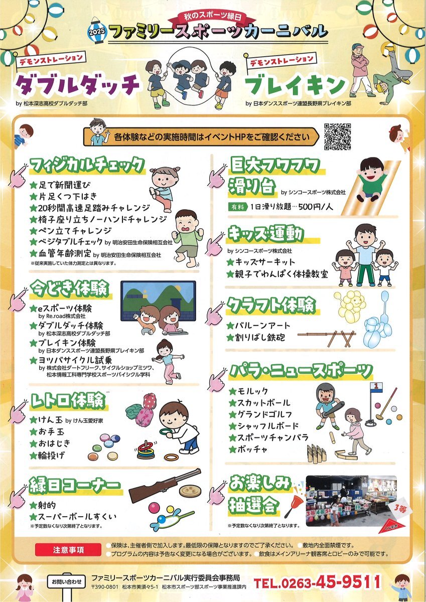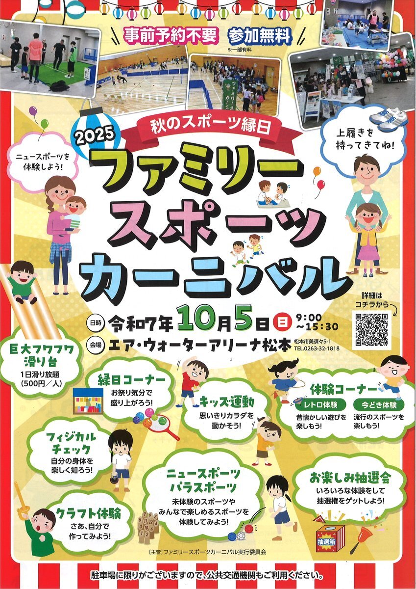 来週10月5日はファミリースポーツカーニバル!! ニュースポーツやパラスポーツ体験、巨大ふわふわ滑り台、フィジカルチェック、お楽しみ抽選会など…盛りだくさん! #松本市 #岡谷 #安曇野市 #エアウォーターアリーナ松本 #イベント #スポーツイベント #ニュースポーツ pic.x.com/OsZ2JLiXD5
