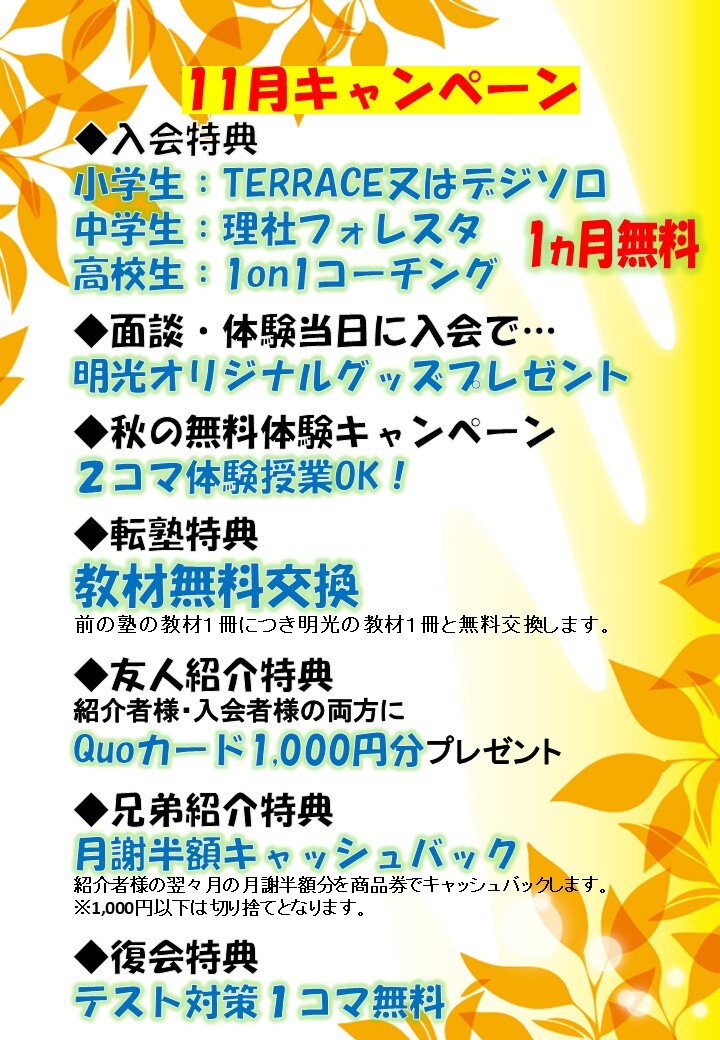 11月の入会特典です。 冬期講習受付スタート!受験生は受験ラストスパート、明光義塾の冬期講習は受験日まで実施! 冬期講習をお考えの方、是非お早めにご検討ください。 #受験対策 #テスト対策 #冬期講習 #入会特典 #岸根公園 #新横浜 #片倉町 #篠原 #六角橋 #城郷 pic.x.com/Xflnj4lddU