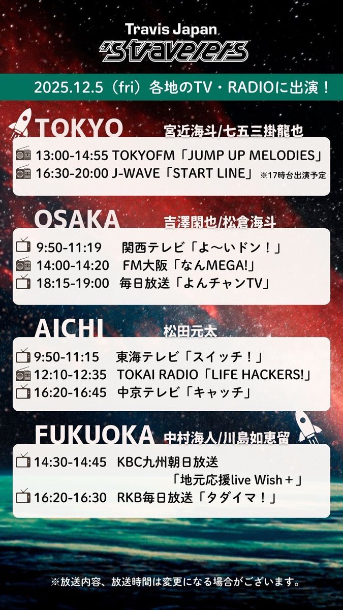 𝟛𝕣𝕕 𝔸𝕝𝕓𝕦𝕞 ’𝕤 𝕥𝕣𝕒𝕧𝕖𝕝𝕖𝕣𝕤 🍓🚀 ⋰ 2025.12.5 (fri) 東京・大阪・愛知・福岡 テレビ&ラジオに出演!!! ⋱ 是非チェックしてください♪ ※放送内容、放送時間は変更になる場合がございます。 #stravelers #TravisJapan #銀河も渡るトラジャ