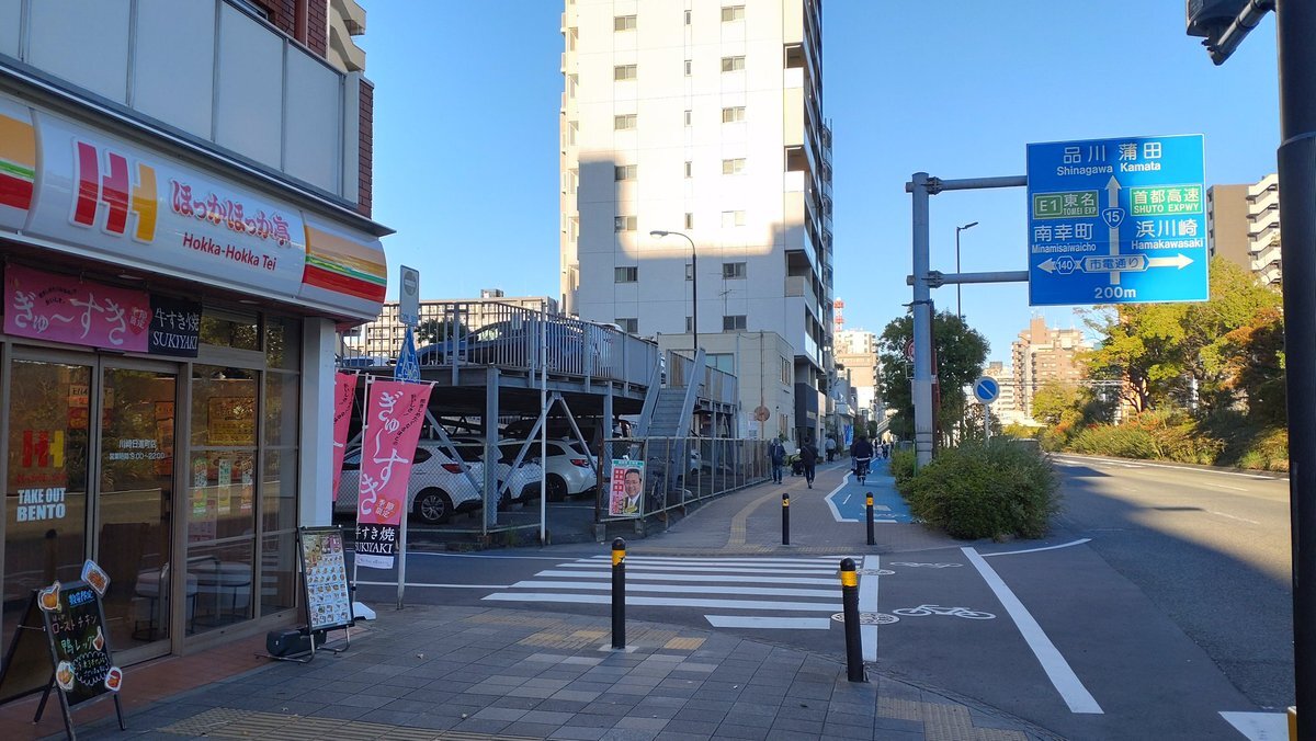 東海道本線貨物支線の線路跡沿いの道から国道15号線に出たら、堀が流れていた国道を東に向かい、元木交差点を渡って耕地整理で混じり合った二ヶ領用水元木堀・渡田堀の下流側に向かった! 交差点のすぐ西の堀跡の道に入って道を一本越えれば、その先に昔の川崎宿と渡田村の境がある!#川崎市 #川崎区 pic.x.com/ce4VnnmOTc