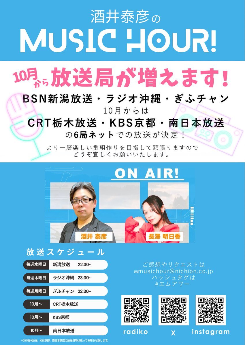 このあと22:30からの #酒井泰彦のMUSICHOUR は、#川嶋あい さん ( @kawashimaai ) がゲスト出演。 #酒井泰彦 のMUSIC HOUR! #BSNラジオ 9/17(水) radiko.jp/share/?t=20250… #エムアワー #長澤明日香 #第77回 (「MH」シリーズ通算520回) 10月からCRT・KBS京都・MBC📻が新たにネット開始!🎊 pic.x.com/GxvAcHAiya x.com/nagasawa_asuka…