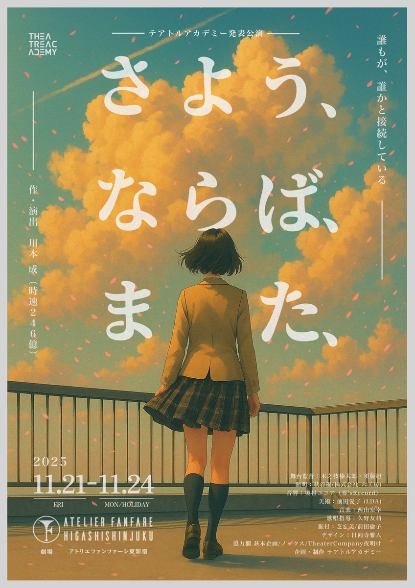 【さよう、ならば、また、】 ⭐️テアトルアカデミー発表公演⭐️ 11月21日(金)〜11月24日(月) #アトリエファンファーレ東新宿 ☆彡チケット予約☆彡 10月20日(月)10時からになります! stage.corich.jp/stage/406626 更新情報をお楽しみに! #テアトルアカデミー #舞台