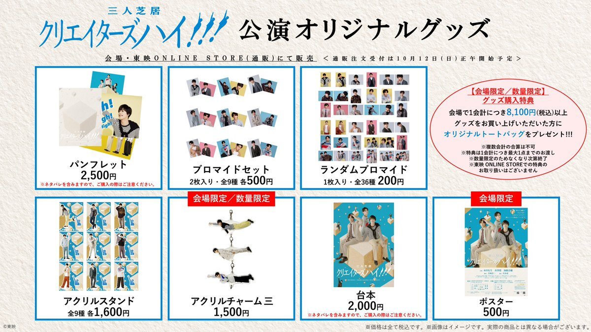 三人芝居「クリエイターズハイ!!!」 グッズラインナップ公開👑✨ 🛍会場限定/数量限定 グッズ購入特典🛍 1会計につき8,100円(税込)以上のご購入で オリジナルトートバッグをプレゼント🎁 🔽詳細 toei-stage.jp/creators-high/… #吉﨑崇二 #川本成 #本田礼生 #赤澤燈 #加藤良輔 #舞台クリハイ #toei_stage pic.x.com/tATbYCDGLs