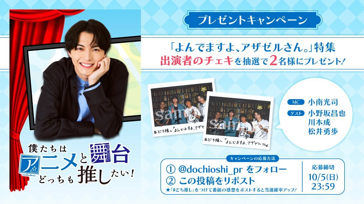 📢プレゼントキャンペーン! #どち推し「よんでますよ、アザゼルさん。」特集 出演者のチェキを抽選で2名様にプレゼント🎁 👥出演者 #小南光司 #小野坂昌也 #川本成 #松井勇歩 ✅応募締切 10月5日(日)23:59 ▼応募方法の詳細は画像をチェック! pic.x.com/tm51e4xQFe