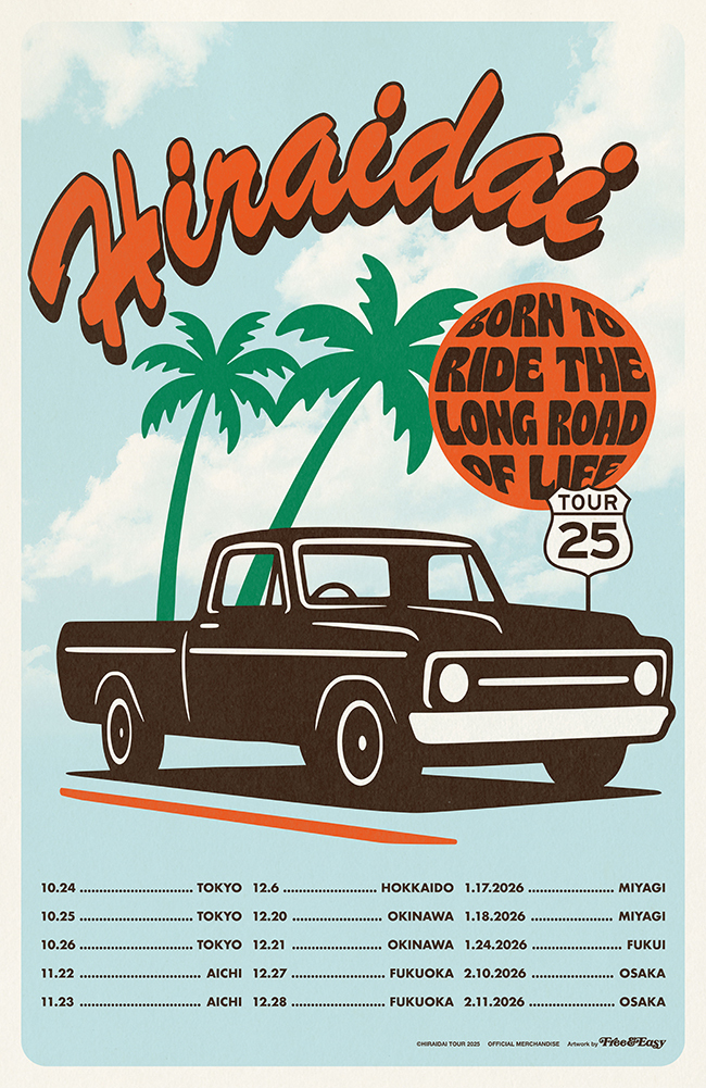 『HIRAIDAI TOUR 2025 limited POP-UP SHOP』を蔦屋書店・TSUTAYA BOOKSTOREにて開催 ︎︎ 代官山 蔦屋書店を皮切りに、ツアー日程の巡回に合わせて全国5箇所で開催いたします。 ︎︎ "Free&Easy"デザインのシルクスクリーンポスターの展示や、POP-UP SHOP限定アイテムの販売もございます。 ︎︎