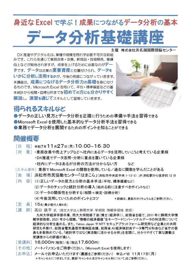 『データ分析基礎講座』11/27(木) 申込み受付中です!Excelを使ったデータ分析スキル(平均・標準偏差から回帰分析、分析前の注意点など)を習得したい方、大歓迎です。 ■詳細 hamanako.jp/info/0263.html #データ分析 #浜松市 #エクセル #平均 #標準偏差 #相関 #t検定 #回帰分析 #Excel x.com/hicjinzai/stat…