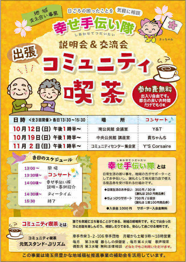 本日10月19日13:30〜 中央公民館にて幸せ手伝い隊説明会 出張コミュニティ喫茶を開催します。 ミニコンサートもありますので是非、お気軽にお立ち寄りください。 #幸手 #地域支え合い pic.x.com/PPDtHur3M0