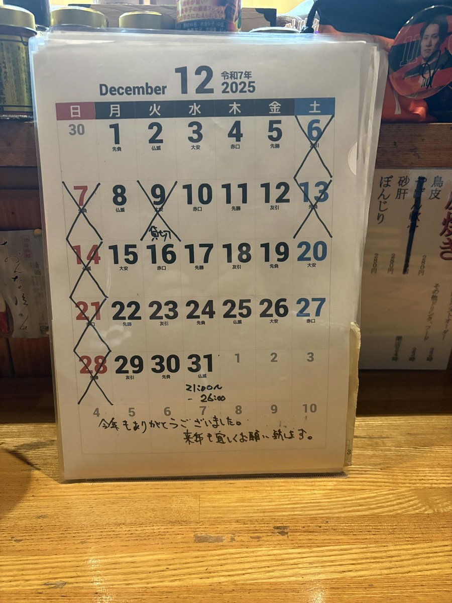 2025/12/01 こんにちは😃 今日も営業致しますので宜しくお願い致します💪 今年最後の営業カレンダーです📅 #居酒屋 #仲二 #居酒屋仲二 #武蔵境 #関前 #柳橋 #串焼き #炭火焼き #焼鳥 #隠れ家 #グルメ #旨い #こだわり #座敷 #日本酒 #営業カレンダー pic.x.com/6ZM65Rr9aC