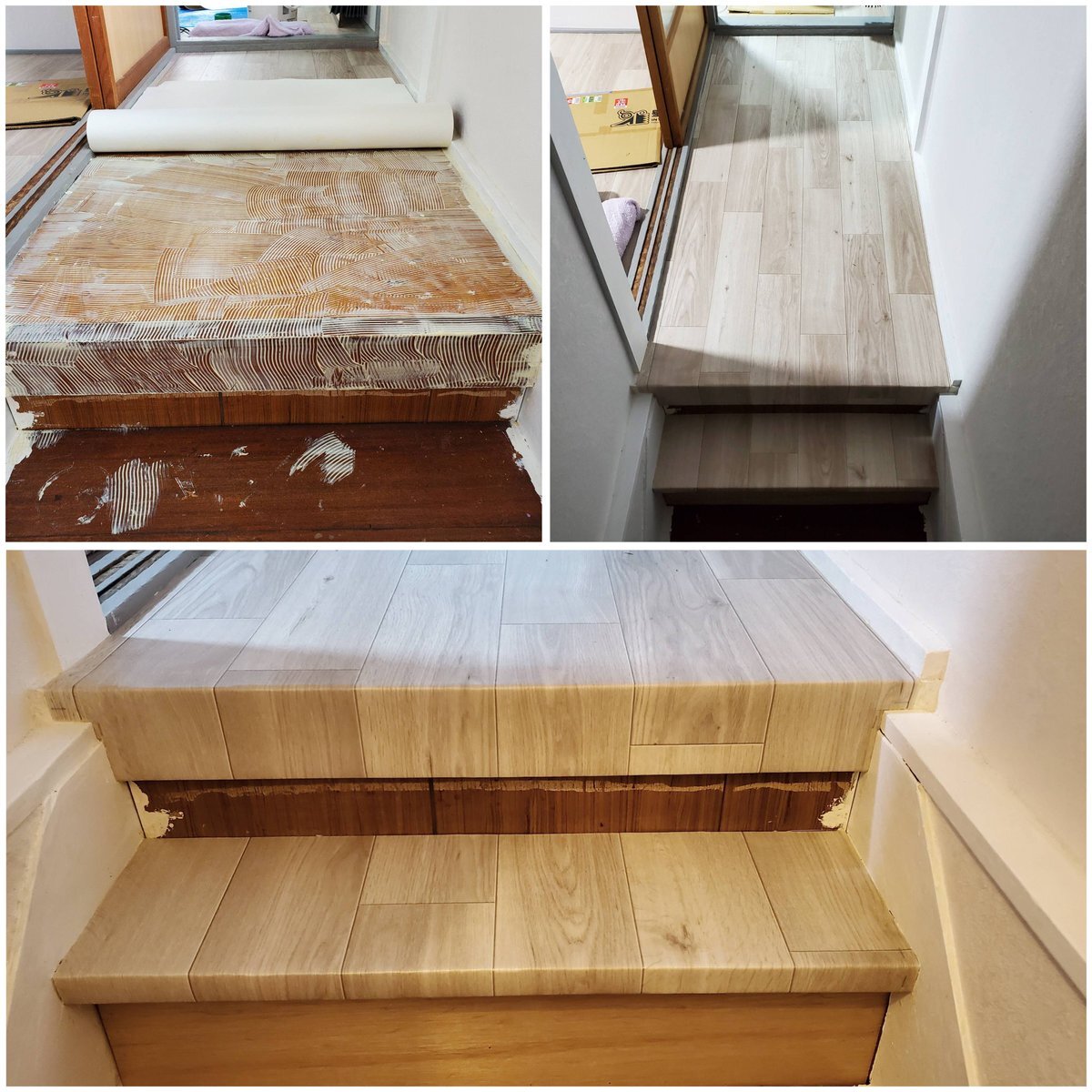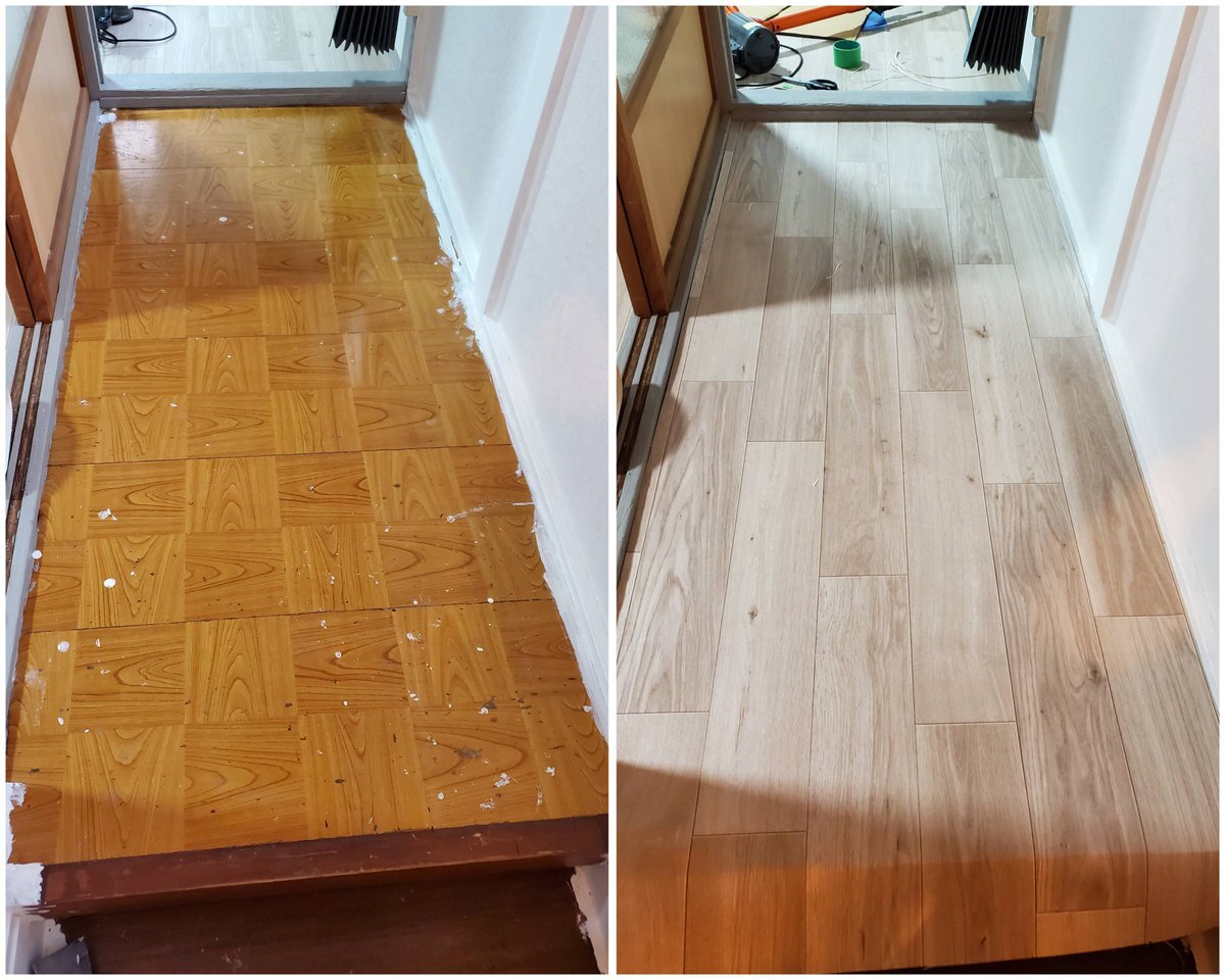 二階 #廊下 の #CF 貼りのつづき💪 半分めくって~クッションフロア用の接着剤を塗って~オープンタイムをとって~そーっと被せて~中心から端に向けて押さえながら空気が入ってるとこや異物感がないかを目視&手の感触で確かめて「よし、何もないぞ👍️」と思う瞬間が好き🤣ちっちゃい充実感✨ #DIY pic.x.com/qTKUtdnoNn x.com/M2103O/status/…