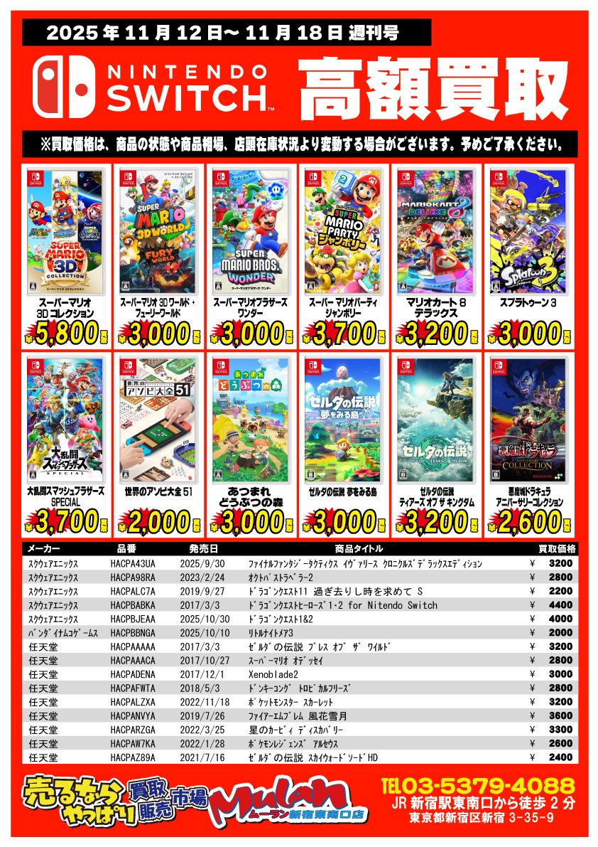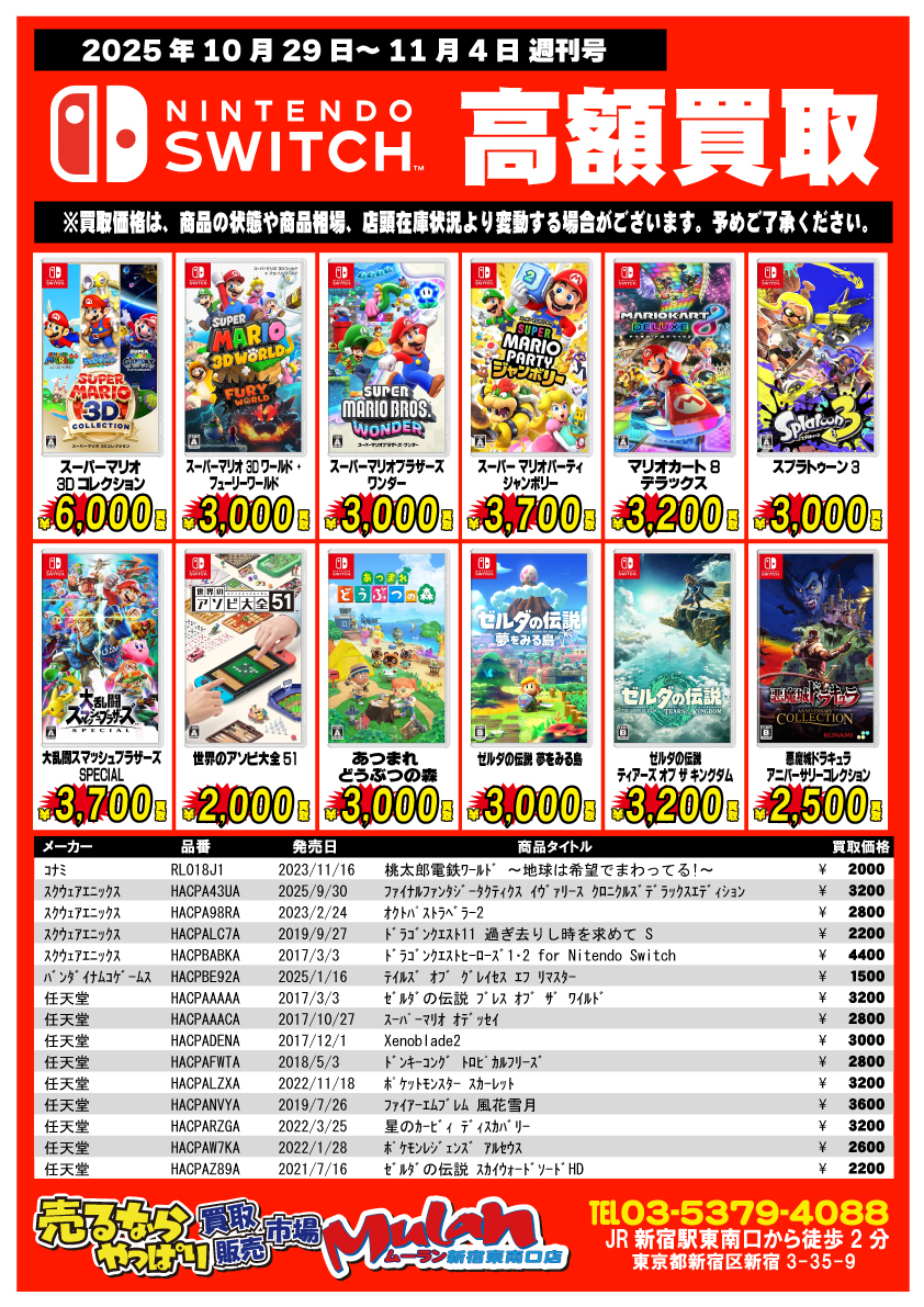 週刊ゲームソフト(#NintendoSwitch)買取強化タイトルになります。 11月19日(水)~11月25日(火)迄 毎週水曜日更新。 ぜひ当店でお売りください。 #SWITCH #ゲーム #買取 #強化 #ムーラン #新宿 pic.x.com/S6FTsyqt3n