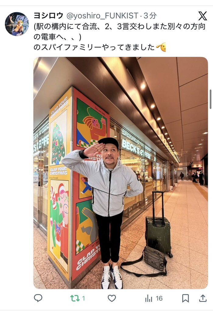 関西へ移動!明日は大阪の高校でソロ。空港への道すがら赤羽駅を歩いていると待ち合わせていたヨシロウとバッタリ。広い世界でこんな偶然あるんだな。ってかこれってもう奇跡だよ。 #待ち合わせ pic.x.com/qR7CrNuaZF