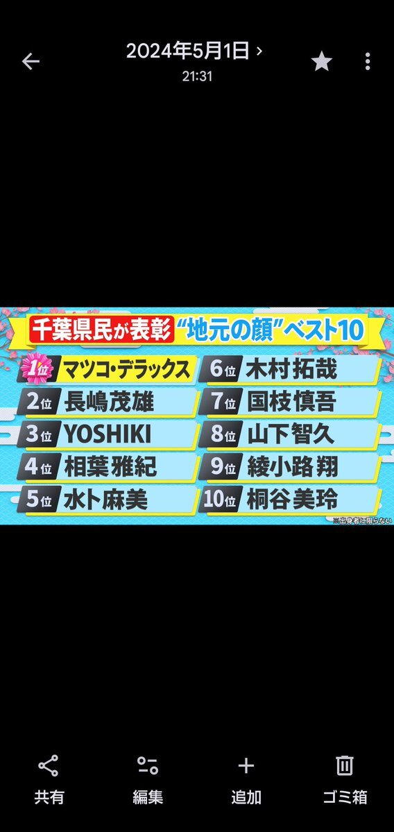 #県民スター栄誉賞、千葉県出身者の我らが #水卜麻美 アナは、昨年と同じ5位!!! 凄いな!!! スタジオに呼ばれていた、千葉県出身 #山里亮太 さんは、1位…の筈もなく(笑)、21位!21位でも、凄いと思うけどね~! #所ジョージ #藤井貴彦 #後呂有紗 pic.x.com/f9PgHcJVXK