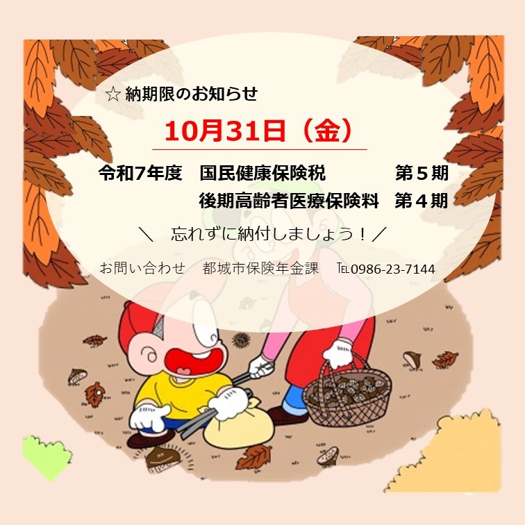 【納期限のお知らせ】10月31日(金)は令和7年度 国民健康保険税 第5期と、後期高齢者医療保険料 第4期の納期限です。お忘れなく納付をお願いします。詳しくは都城市HPをご確認ください。 city.miyakonojo.miyazaki.jp/soshiki/52/267… #都城市国保 #国保税 #納期限 #後期高齢者 #医療保険料 #都城市からのお知らせ #期限厳守 pic.x.com/H1YBEZXlEC