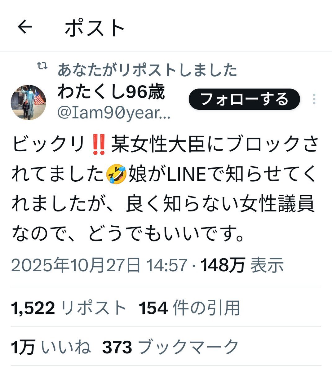 返信先:@satsukikatayama現職の女性大臣が、9万人近いフォロワーを持つインフルエンサーの #後期高齢者 Xユーザーをブロックしたそうです。#介護保険 の自己負担額を上げる議論の最中、#自民党 のネット対策としては良くないと思います。#片山さつき 財務相から、当該大臣に忠告してあげて下さい。x.com/Iam90yearsold/… pic.x.com/EUuxYuIrnu