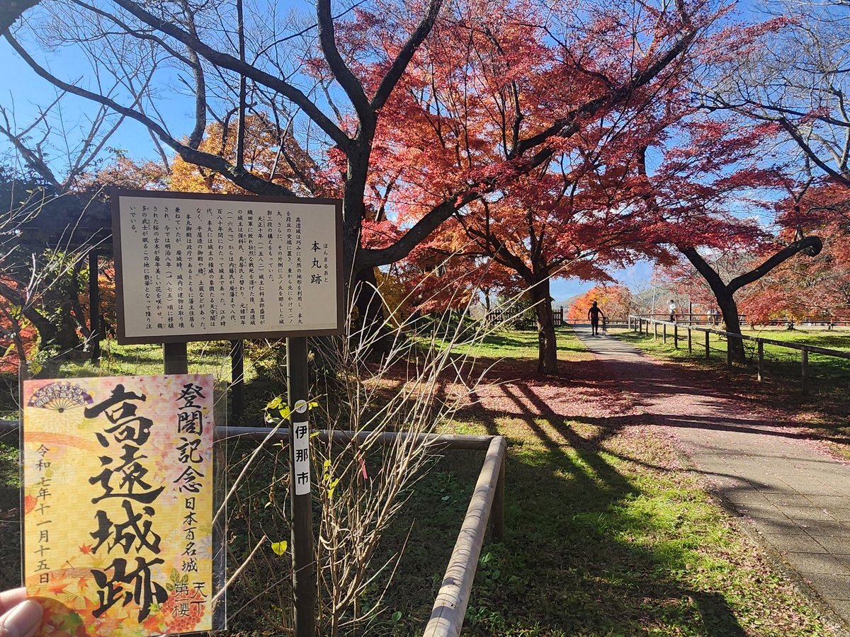 御城印探訪 高遠城 開園150周年を迎えた高遠城は桜の名所であり紅葉の名所でもあります。 赤黄橙と色鮮やかな葉が城址を彩り、錦秋の風景につい足を止めてしまうほど🍁 落葉はじめのようですがまだ紅葉を楽しむことができます 高遠町歴史博物館にて150周年和柄版を購入 #御城印 #高遠町 pic.x.com/eoONSX7fuT