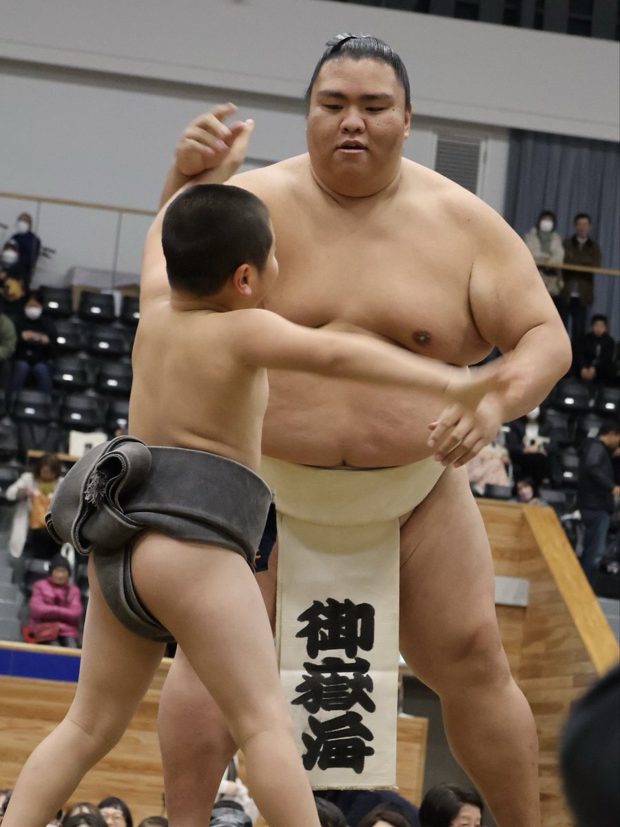 子どもとの稽古。 ①紹介する若元春と両手を挙げる日向丸。 ②日向丸に気合いを入れる一山本。 ③子どもの投げに倒れる日向丸。 ④日向丸に詰め寄る若元春。 #御嶽海 〔宮崎巡業〕 #列島ニュース #sumo pic.x.com/gF0ejTrIbK