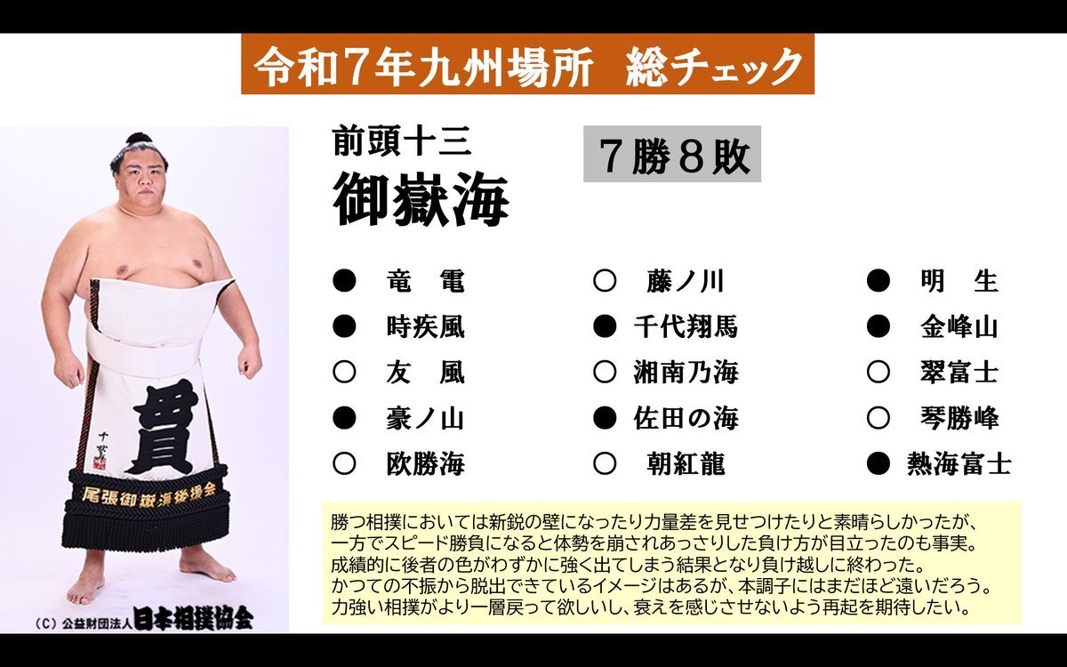 九州場所千秋楽御嶽海。7勝7敗の千秋楽だったが敗れて惜しくも勝ち越しならず。もうちょっとだった。ロンドンではリラックスした姿を見せていたが、お母さんを亡くして、少しずつ頑張っている感じだろう。来年は勝ち越して、また上位に戻っていきたいね。頑張れ御嶽海。#大相撲 #御嶽海 pic.x.com/RVGKFU15lq