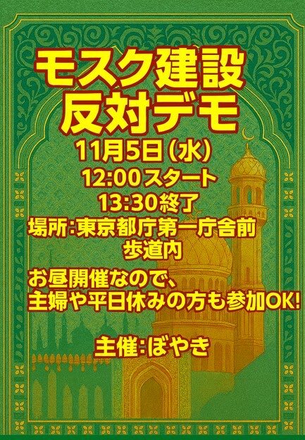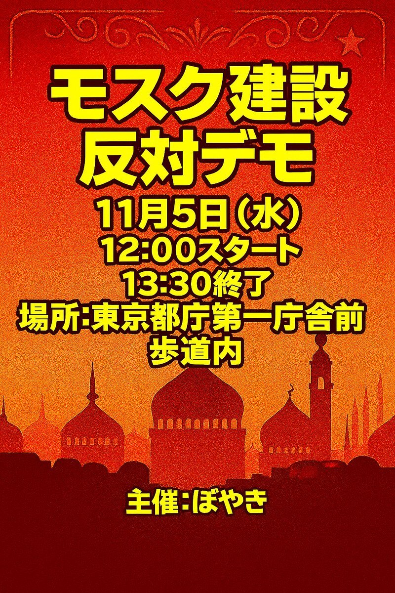 🚩拡散希望🚩 📣都庁前デモ速報!! 【モスク建設反対デモ】 お昼開催なので主婦や平日休みの方も参加OK⭕️ 11/12(水) 12:00〜13:30モスク建設反対デモで緊急開催します‼️ 場所:東京都庁第一庁舎前歩道内 #モスク建設反対 #モスク建設反対デモ #小池百合子 #移民政策反対 #御徒町モスク #御徒町駅 x.com/boyaki_daichi/…